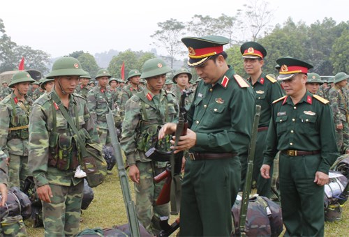 Thiếu tướng Phùng Sĩ Tấn kiểm tra công tác chuẩn bị của bộ đội Trung đoàn 148 (Sư đoàn 316) trước khi tham gia diễn tập. Ảnh: VIẾT DƯƠNG