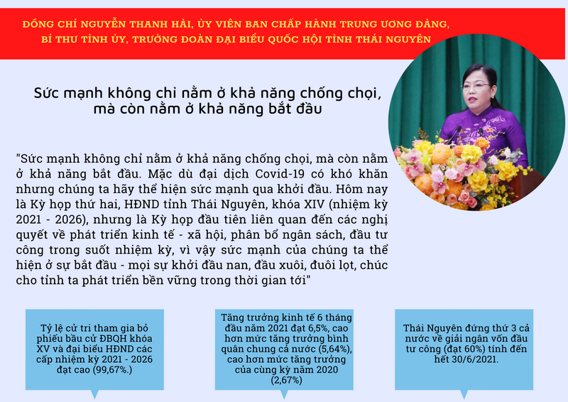 Trong 7 tháng năm 2021, tỉnh Thái Nguyên đã có nhiều con số ấn tượng như: Tỷ lệ cử tri tham gia bỏ phiếu bầu cử đại biểu Quốc hội khóa XV và đại biểu HĐND các cấp nhiệm kỳ 2021-2026 đạt cao (99,67%); tăng trưởng kinh tế đạt 6,5%, cao hơn mức tăng trưởng bình quân chung cả nước (5,64%), cao hơn mức tăng trưởng của cùng kỳ năm 2020 (2,67%); tỉnh Thái Nguyên đứng thứ ba cả nước về giải ngân vốn đầu tư công (đạt 60%) tính đến hết 30-6-2021; tổng thu ngân sách nhà nước trên địa bàn tỉnh đạt 9.181 tỷ đồng, tăng so với cùng kỳ 25,7% và là một trong 20 tỉnh có thu ngân sách cao nhất toàn quốc; Thái Nguyên lọt vào Tốp 10 tỉnh có bình quân thu nhập của người lao động trong khu công nghiệp cao nhất toàn quốc với 9,4 triệu đồng…