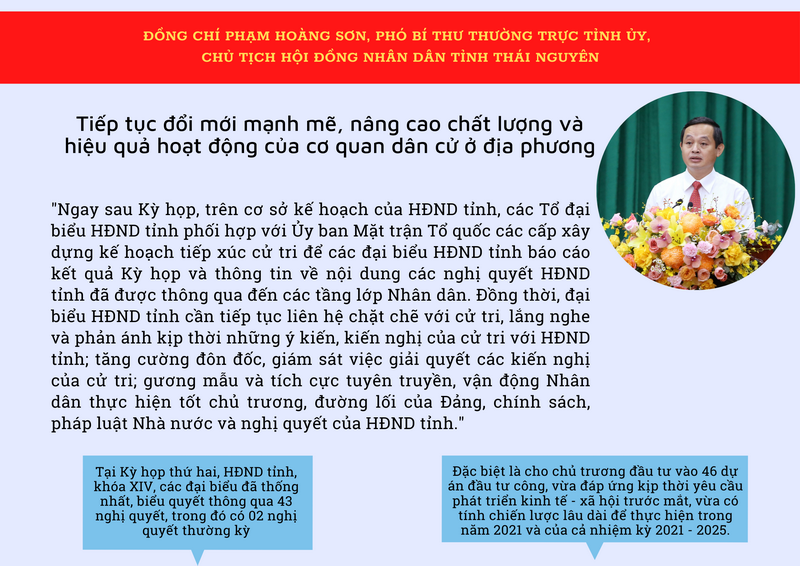 Trong bối cảnh đại dịch Covid-19 đang diễn ra hết sức phức tạp, với tinh thần đổi mới, cải cách hành chính, Kỳ họp thứ hai đã hoàn thành nội dung chương trình sớm hơn 1,5 ngày so với dự kiến nhưng vẫn bảo đảm chất lượng cao nhất đối với các nội dung được thông qua tại Kỳ họp; đồng thời phát huy được tinh thần trách nhiệm và trí tuệ của các đại biểu. Thành công của Kỳ họp thứ hai, HĐND tỉnh Thái Nguyên khóa XIV, nhiệm kỳ 2021-2026 tiếp tục tạo điều kiện và là tiền đề thuận lợi cho một nhiệm kỳ mới với tinh thần đổi mới nhằm nâng cao chất lượng và hiệu quả hoạt động của cơ quan dân cử ở địa phương.