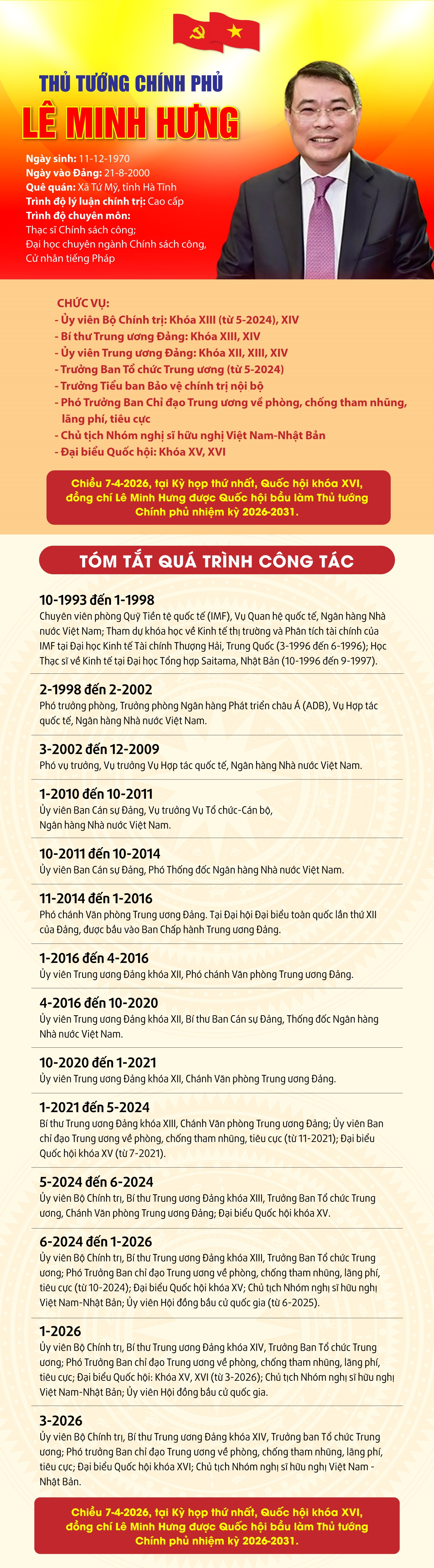 Chiều 7-4-2026, tại Kỳ họp thứ nhất, Quốc hội khóa XVI, đồng chí Lê Minh Hưng, Ủy viên Bộ Chính trị, Bí thư Trung ương Đảng, Trưởng ban Tổ chức Trung ương đã được Quốc hội tín nhiệm bầu làm Thủ tướng Chính phủ nhiệm kỳ 2026-2031.