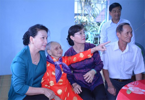 Chủ tịch Quốc hội Nguyễn Thị Kim Ngân thăm hỏi và tặng quà Bà mẹ Việt Nam anh hùng Nguyễn Thị Kịch tại ấp Mũi Lớn, xã Tân Hội An, huyện Củ Chi, TP Hồ Chí Minh. Ảnh: CHIẾN THẮNG
