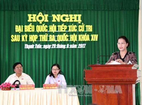 Chủ tịch Quốc hội Nguyễn Thị Kim Ngân cùng Đoàn đại biểu Quốc hội TP Cần Thơ tiếp xúc cử tri xã Thạnh Tiến, huyện Vĩnh Thạnh, TP Cần Thơ. Ảnh: TTXVN