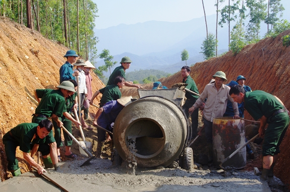 Cán bộ, chiến sĩ Bộ CHQS tỉnh Tuyên Quang giúp dân xã Thượng Ấm, huyện Sơn Dương làm đường bê tông nông thôn. Ảnh: ĐĂNG NINH |