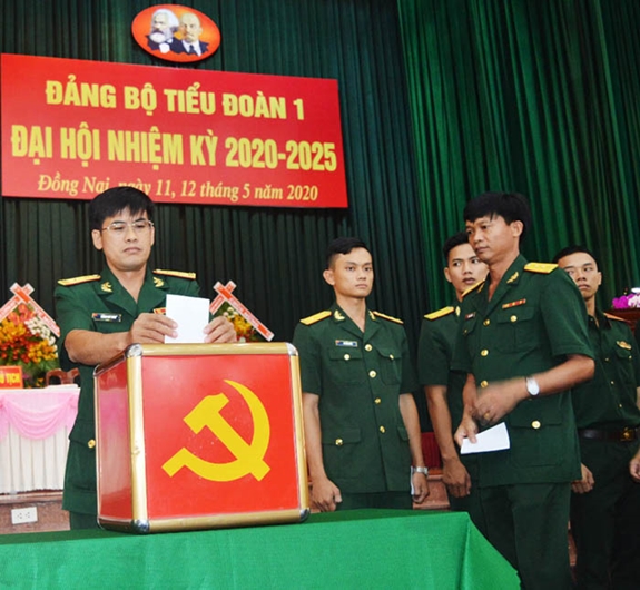 Đại hội Đảng bộ Tiểu đoàn 1 (Trường Sĩ quan Lục quân 2) bỏ phiếu bầu Ban Chấp hành nhiệm kỳ 2020-2025. Ảnh: NHỰT LINH |