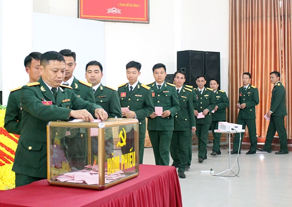 Các đại biểu tiến hành bầu cử tại Đại hội Đảng bộ Trung đoàn 1 (Sư đoàn 324). |