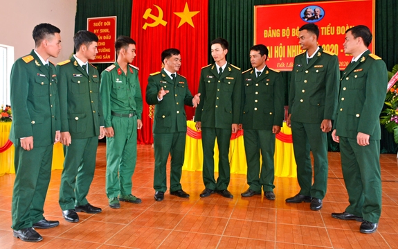 Đại biểu cấp trên và Đảng viên dự Đại hội Đảng bộ Bộ phận Tiểu đoàn 8 trao đổi trong giờ nghỉ giải lao. |