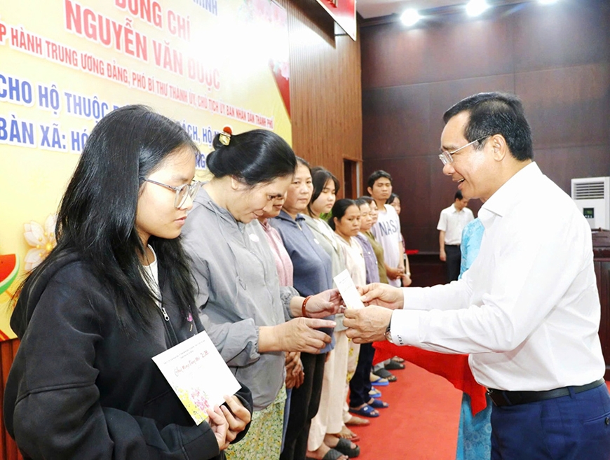 | Đồng chí Nguyễn Văn Được, Ủy viên Trung ương Đảng, Chủ tịch UBND TP Hồ Chí Minh tặng quà người dân có hoàn cảnh khó khăn trên địa bàn. |