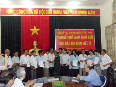 Đây là buổi trao giấy chứng nhận kết quả giám định gen hài cốt liệt sỹ lần thứ 10 (đợt 3, ngày 18-4 -2012) của Hội, đánh giá sự nỗ lực không ngừng của Hội, của các cấp chính quyền đối với những anh hùng, liệt sĩ đã hy sinh vì độc lập tự do của Tổ quốc.