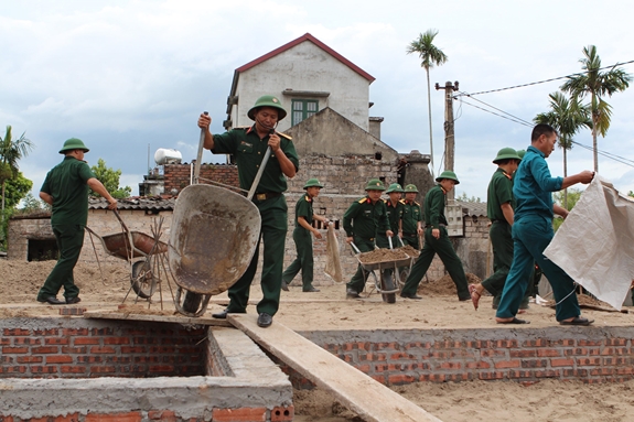 Cán bộ, chiến sĩ LLVT tỉnh Thái Bình giúp gia đình ông Trần Văn Thoại xây nhà tình nghĩa. |