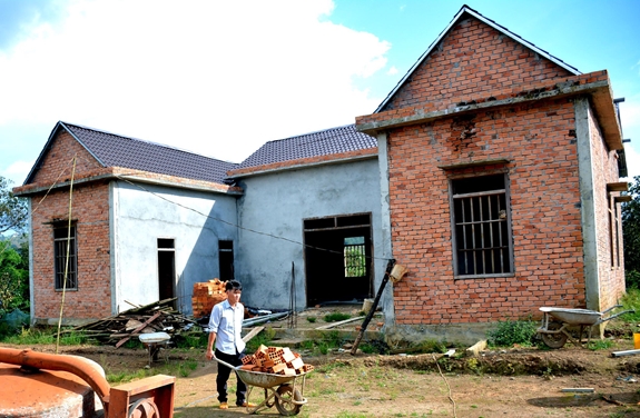 Trưởng bản Giàng A Vảng đang hoàn thiện nhà mới. |