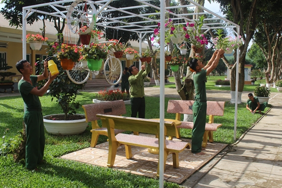 Cán bộ, chiến sĩ Tiểu đoàn 5 (Trung đoàn 19, Sư đoàn 968) chăm sóc hoa, cây cảnh trong khuôn viên đơn vị.