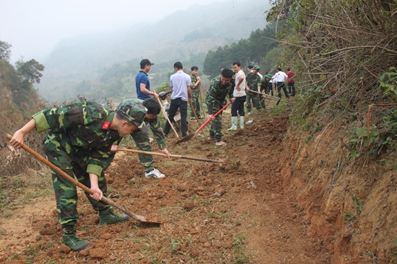 Được biết, tuyến đường liên thôn này dài hơn 2km, được mở rộng 3 mét nhưng phải huy động tới hơn 400 nhân công để phá núi, mở đường. Mặc dù công việc nặng nhọc, khó khăn, vất vả, nhưng trời vừa tảng sáng, sương còn chưa tan, cán bộ, chiến sĩ, trí thức trẻ tình nguyện Đoàn KTQP 313 cùng các lực lượng và nhân dân địa phương đã có mặt đông đủ. Sau lễ phát động, theo sự phân công, mọi người nhanh chóng vào vị trí. Người đào, người xúc, người san... tiếng cuốc xẻng va vào đá vang vọng cả một vùng. Mặc dù mồ hôi ướt đẫm áo, song không lúc nào ngớt tiếng cười nói, ai nấy đều hăng say làm việc.