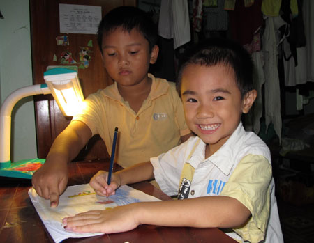 “Để tớ vẽ nốt con thuyền đang căng buồm ra biển rồi mình cùng xem nhé” - Bé Ngô Quốc Bảo (7 tuổi) cười tít mắt nói với cậu bạn cùng lớp Lê Anh Phương...