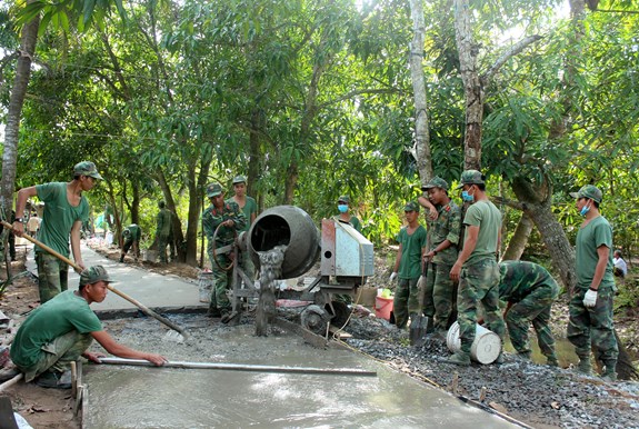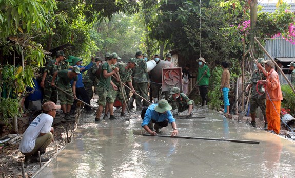 Bộ đội Tiểu đoàn 5, Trung đoàn 9 làm đường bê tông tại ấp 6, xã Phong Mỹ (Cao Lãnh, Đồng Tháp). Ảnh: HỮU CƯỜNG