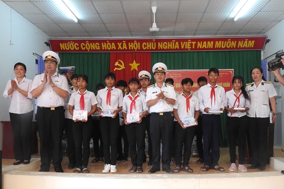 Cán bộ Ban Phụ nữ Quân chủng Hải quân và chỉ huy Lữ đoàn 957 (Vùng 4 Hải quân) trao quà, động viên học sinh là con em bộ đội Trường Sa đạt thành tích cao trong học tập. Ảnh: ĐỨC THU |