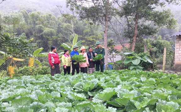 Cán bộ Đoàn Kinh tế-Quốc phòng 5 hướng dẫn bà con trồng và thu hoạch rau xanh. |