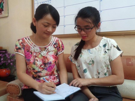 Chị Nguyễn Thị Mai Hoa (bên trái) trao đổi kinh nghiệm giảng dạy cùng đồng nghiệp.