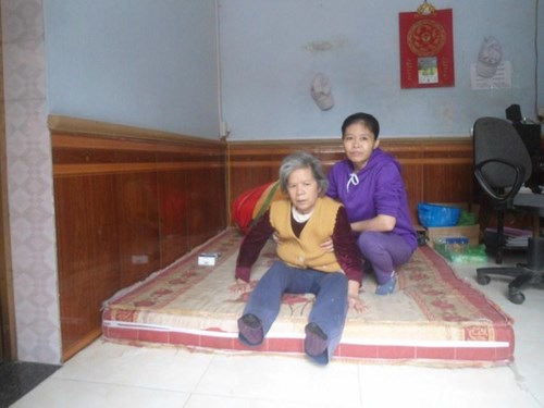Chị Phan Thị Ngọc Yến chăm sóc mẹ chồng trong căn nhà ở nhờ hàng xóm. |