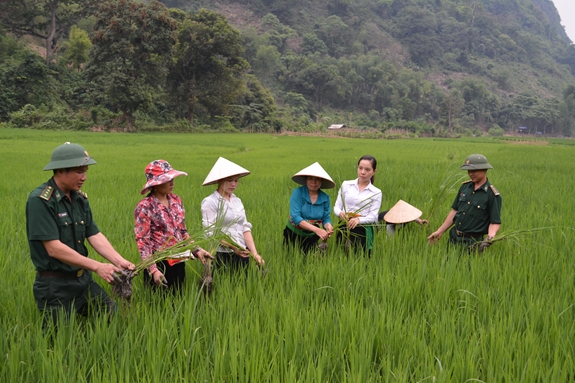 Cán bộ, nhân viên Đồn Biên phòng Tam Chung và cán bộ địa phương hướng dẫn người dân kỹ thuật trồng lúa nước. Ảnh: THANH THỦY