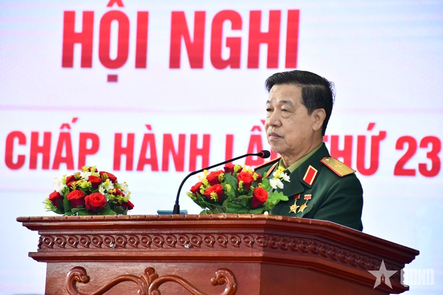 | Thiếu tướng Nguyễn Xuân Sang phát biểu kết luận hội nghị. |
