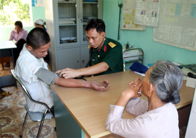 Cán bộ quân y Lữ đoàn xe tăng 201 khám bệnh, cấp thuốc miễn phí cho người dân trên địa bàn đóng quân (thị trấn Xuân Mai, Chương Mỹ, Hà Nội)