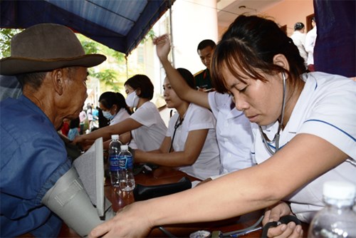 Lực lượng y tế địa phương tỉnh Quảng Bình phối hợp với các đoàn công tác tổ chức khám bệnh, cấp thuốc miễn phí cho người dân vùng lũ.