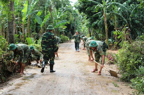 Bộ đội Sư đoàn 968 giúp bà con huyện Cam Lộ, tỉnh Quảng Trị dọn sạch đường đi lối xóm.