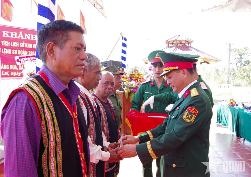 Các đại biểu thực hiện nghi thức mở băng khánh thành Bia Di tích lịch sử khu vực bố trí Sở chỉ huy cơ bản của Bộ tư lệnh Sư đoàn 320A.