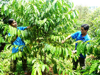 Đào Công Lưu (bên phải) cùng ĐVTV Trung đoàn 720 chăm sóc vườn cà phê.