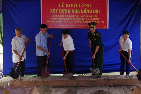 Sáng 11-9, Bộ chỉ huy Bộ đội Biên phòng (BĐBP) tỉnh Nghệ An phối hợp cùng cấp ủy, chính quyền địa phương tổ chức khởi công xây dựng nhà đồng đội tặng gia đình Đại úy Nguyễn Đình Tài, Trinh sát viên phòng chống ma túy và tội phạm, BĐBP tỉnh, bị thương trong khi làm nhiệm vụ.