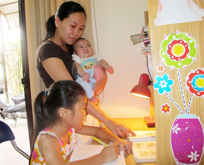 Chị Huyền hướng dẫn con học bài.
