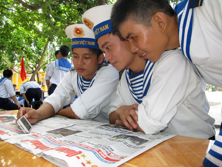 | Các chiến sĩ trên đảo Sơn Ca, đọc báo QĐND hằng ngày và truy cập vào Báo QĐND Điện tử. |
