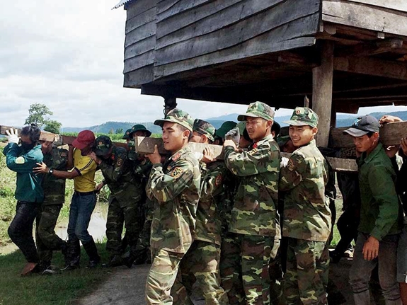 Khi những ngôi nhà đầu tiên được di dời thành công, chúng tôi thở phào nhẹ nhõm. Là chính trị viên phó tiểu đoàn, được cấp trên giao nhiệm vụ chỉ huy lực lượng giúp nhân dân nên tôi không khỏi trăn trở. Địa phương và đồng bào cũng rất tin tưởng, mong đợi chúng tôi, nhưng công việc di dời hơn 40 ngôi nhà chưa có tiền lệ ở đơn vị. Một ngôi nhà sàn của người Ba Na thường rộng hơn 30m2, nặng từ 2 đến 6 tấn, phải 150 người hợp sức lại mới di dời đi được.