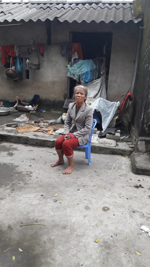Bà Nguyễn Thị Hòa trước căn nhà tồi tàn, đang xuống cấp của gia đình.