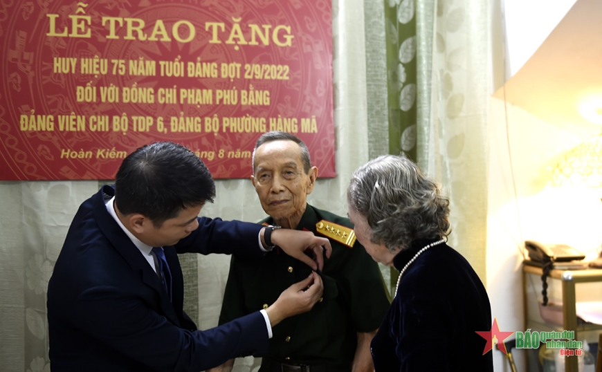 | Thay mặt lãnh đạo Đảng bộ quận Hoàn Kiếm, đồng chí Phạm Tuấn Long, Phó bí thư Quận ủy, Chủ tịch UBND quận Hoàn Kiếm cài Huy hiệu 75 năm tuổi Đảng tặng nhà báo Phạm Phú Bằng. |