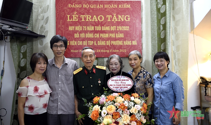 | Cán bộ, phóng viên Báo Quân đội nhân dân chúc mừng nhà báo Phạm Phú Bằng nhân dịp ông được nhận Huy hiệu 75 năm tuổi Đảng. |