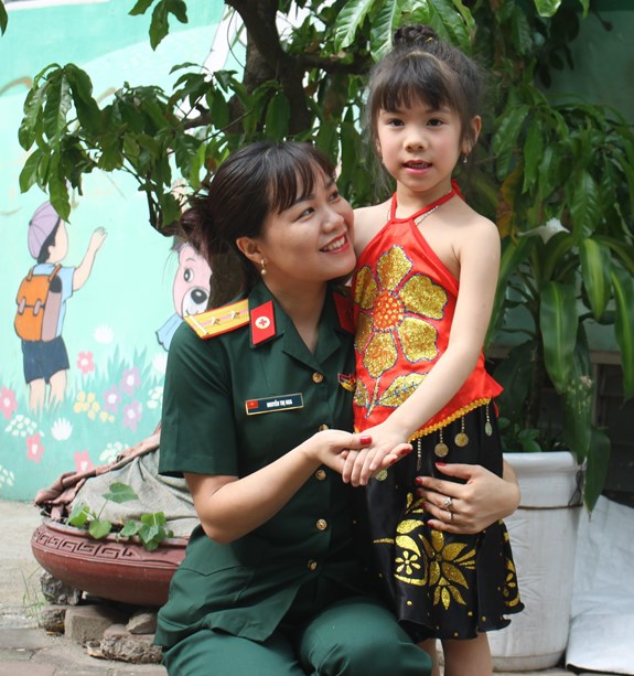 Trung úy QNCN Nguyễn Thị Nga cùng con gái tại Trường Mầm non Hoa phượng đỏ.