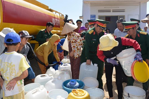 Với tinh thần “không để nhân dân thiếu nước ăn, nước uống”, ngay từ giữa tháng 2-2016, Bộ tư lệnh Quân khu 5 đã huy động 3 xe bồn chở nước cùng với Bộ CHQS tỉnh Ninh Thuận phối hợp với các ngành chức năng của địa phương hằng ngày chở nước sinh hoạt giúp hơn 250 hộ dân với gần 900 nhân khẩu ở thôn Khánh Tân (xã Nhơn Hải, huyện Ninh Hải). Từ đầu tháng 3 đến nay, Trung đoàn Vận tải 655 (Cục Hậu cần) liên tục vận chuyển hàng nghìn mét khối nước uống, nước sinh hoạt cấp phát cho đồng bào các thôn: Khánh Tân (xã Nhơn Hải, huyện Ninh Hải), Tam Lang (xã Phước Nam, huyện Thuận Nam). Ông Nguyễn Thành ở thôn Khánh Tân tâm sự: “Hơn tháng trời, gia đình tôi và nhiều hộ trong thôn phải mua nước sạch ở xa với giá 100.000 đồng/m3. Nay được bộ đội Quân khu 5 đưa nước đến tận nơi phát miễn phí, bà con rất phấn khởi. Dân Khánh Tân rất biết ơn Bộ đội Cụ Hồ!”.