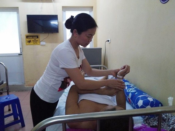 Chị Đinh Thị Phương Thúy chăm sóc chồng tại bệnh viện.