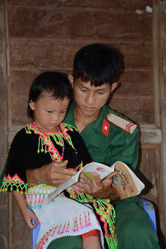 Binh nhất Giàng A Bình hướng dẫn em gái học tập trong lần về phép.