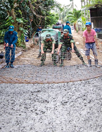 Cán bộ, chiến sĩ lực lượng vũ trang TP Cần Thơ xây dựng đường giao thông nông thôn tại phường Thới An, quận Ô Môn, TP Cần Thơ.