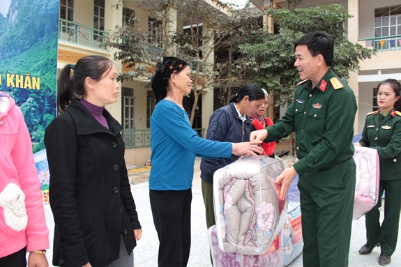 Đại tá Nguyễn Minh Thao, Phó chủ nhiệm Chính trị Quân khu 1 tặng quà cho các hội viên phụ nữ xã Cần Nông, huyện Thông Nông, tỉnh Cao Bằng. |