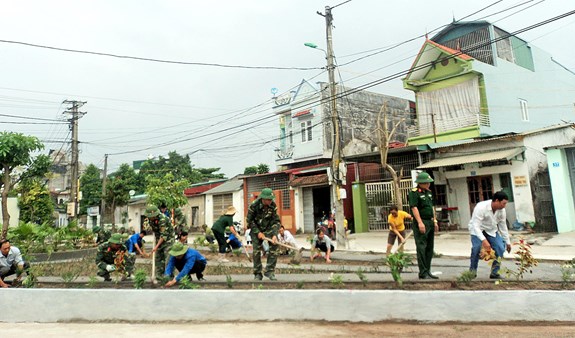 Mới 7 giờ, nhưng vườn hoa của khu phố 3, phường Hải Hòa (TP Móng Cái, tỉnh Quảng Ninh) đã rợp màu xanh quân phục và màu áo xanh của các đội viên TTTTN Lâm trường 27 cùng nhân dân địa phương. Mỗi người một việc, người xây trát tường bao các bồn hoa, người phụ vữa, người quét vôi ve và xới đất, trồng cây. Tiếng cuốc, xẻng, bay xoa hòa cùng tiếng cười nói vui vẻ khiến không khí buổi lao động thêm rộn ràng.