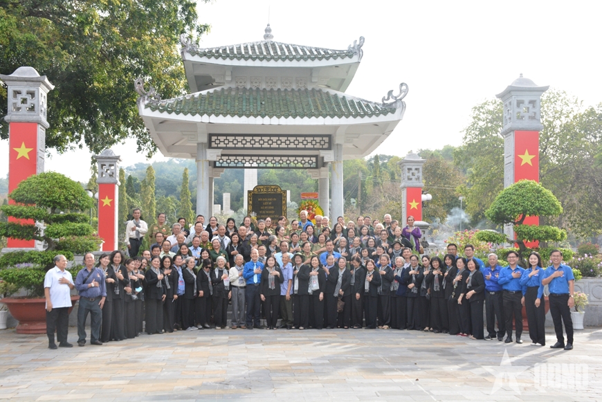 | Các thế hệ đoàn viên, thanh niên chụp ảnh tại Nghĩa trang liệt sĩ Đồi 82. |