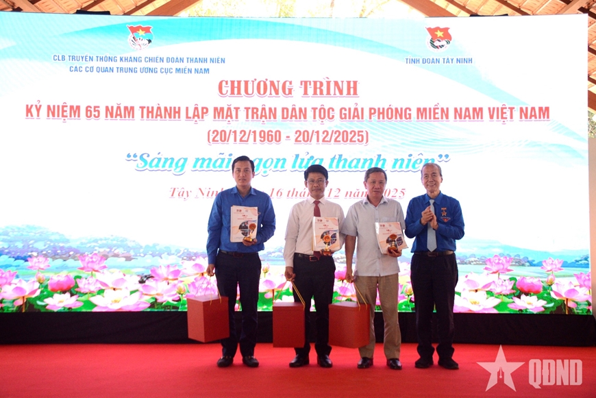 | Đại diện Câu lạc bộ Truyền thống kháng chiến Đoàn Thanh niên các cơ quan Trung ương Cục miền Nam trao quà lưu niệm tặng tuổi trẻ tỉnh Tây Ninh. |