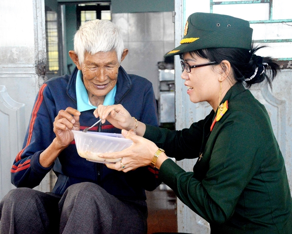 Hội viên Hội Phụ nữ cơ quan Bộ CHQS tỉnh Gia Lai bón cháo cho người già neo đơn tại Trung tâm Bảo trợ xã hội tổng hợp tỉnh.