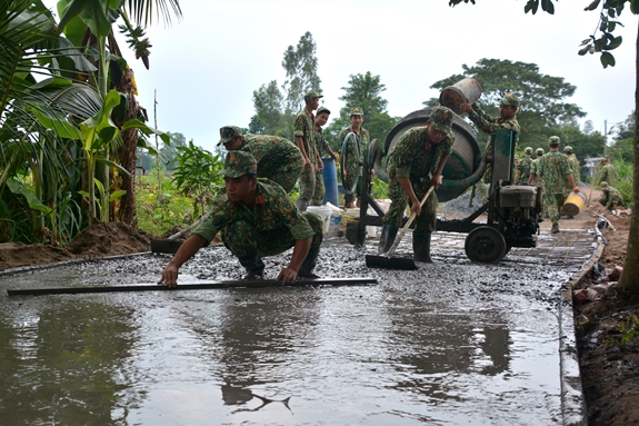 Cán bộ, chiến sĩ Tiểu đoàn 4, Trung đoàn 9 làm đường giao thông nông thôn tại xã Phong Mỹ, huyện Cao Lãnh, tỉnh Đồng Tháp. Ảnh: QUANG ĐỨC |