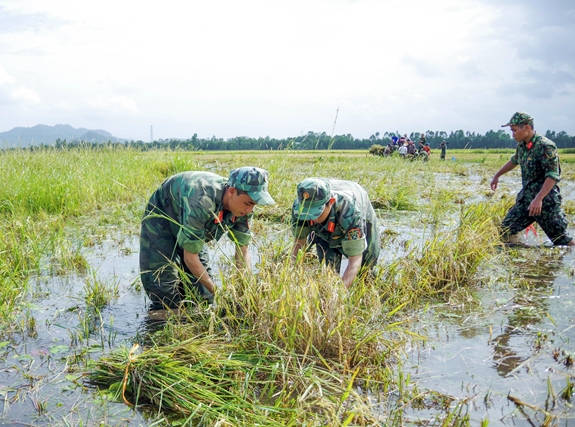 Cán bộ, chiến sĩ Tiểu đoàn 511, Trung đoàn 892, Bộ CHQS tỉnh An Giang giúp người dân xã Khánh Hòa, huyện Châu Phú, tỉnh An Giang gặt lúa vào tháng 9-2018. Ảnh: ĐỨC QUANG