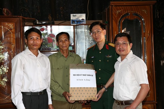 Đại tá Cao Trung Hà, Phó chủ nhiệm Chính trị, Học viện Kỹ thuật Quân sự tặng quà cho các gia đình chính sách.