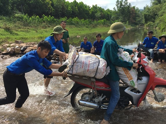Học viên, sinh viên giúp nhân dân đi qua vùng nước xiết.